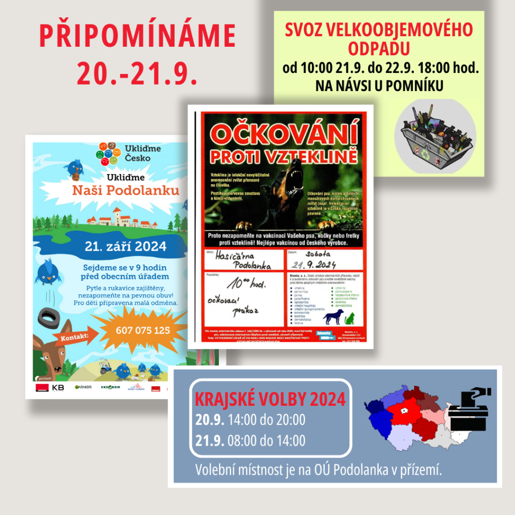 v sobotu 21.9. od 10:00 proběhne před hasičárnou, očkování psů a koček proti vzteklině a ostatním virózám. Též lze očkovat domácí pet-králíčky proti moru a myxomatóze.