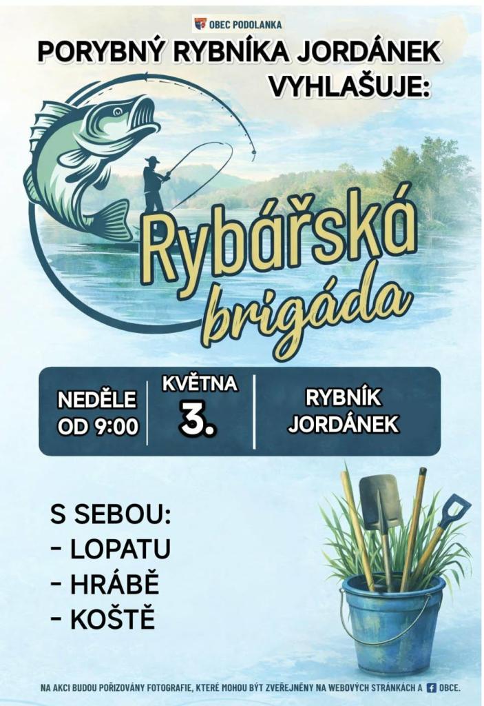 V neděli 3.5. se uskuteční rybářská brigáda. Sraz účastníků v 9:00 u Jordánku, s sebou lopatu, hrábě a koště. Podrobnější informace a instrukce obdržíte na místě.