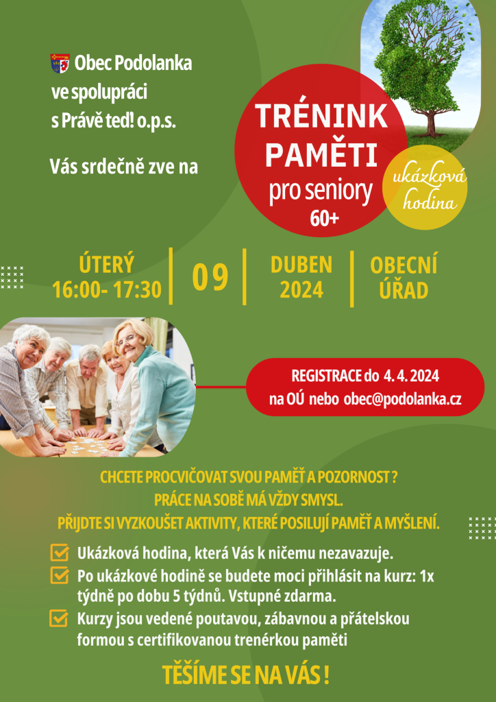 V úterý 9. 4. od 16:00 se koná ukázková hodina kurzu Trénink paměti pro seniory 60+.