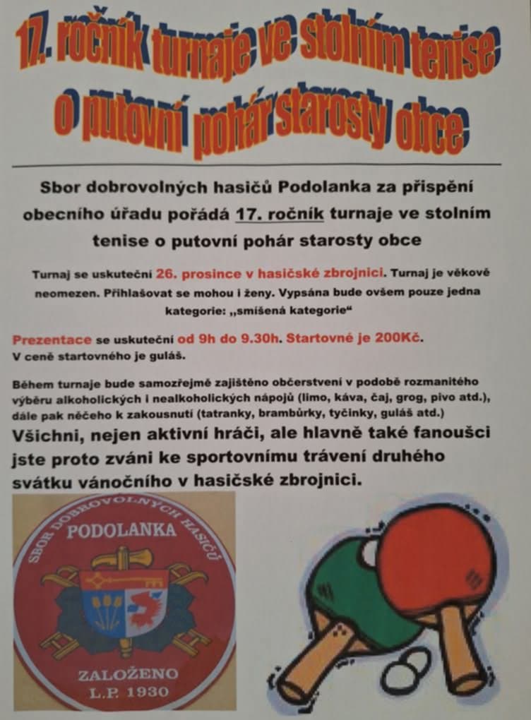 Zveme Vás na 17. ročník turnaje ve stolním tenise. Přijďte si zasoutěžit a užít si zábavu se svými sousedy. Vítěz získá putovní pohár starosty obce.